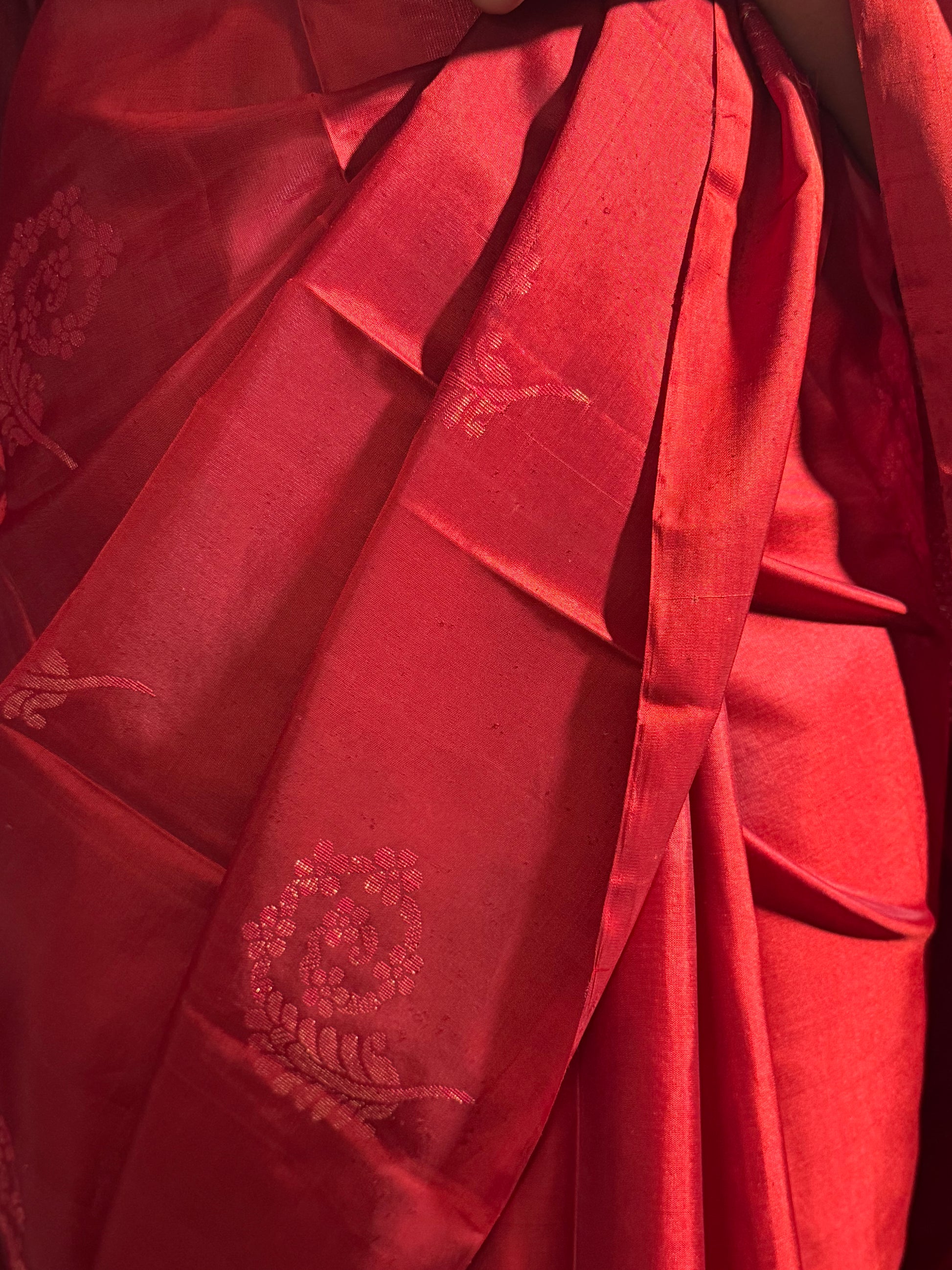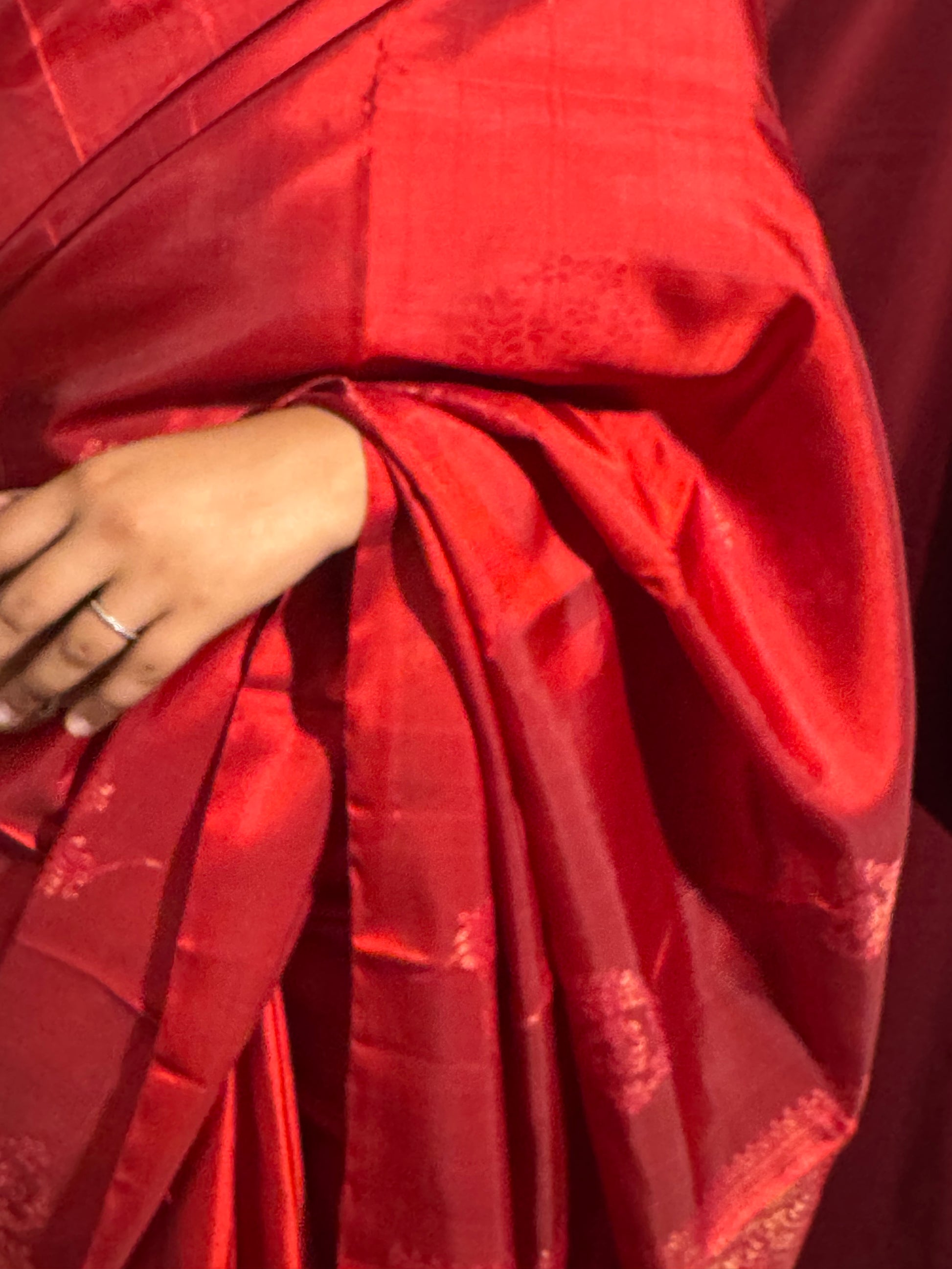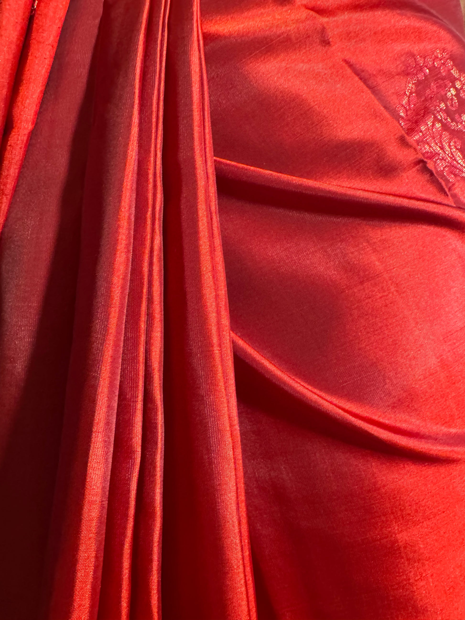 Ruhlaal — where red becomes a feeling. Woven in premium soft silk and touched with a subtle golden sheen, this saree captures the essence of heritage with the fluid grace of modern elegance. The hue is bold, sacred, and timeless — a color that tells stories without a single word.