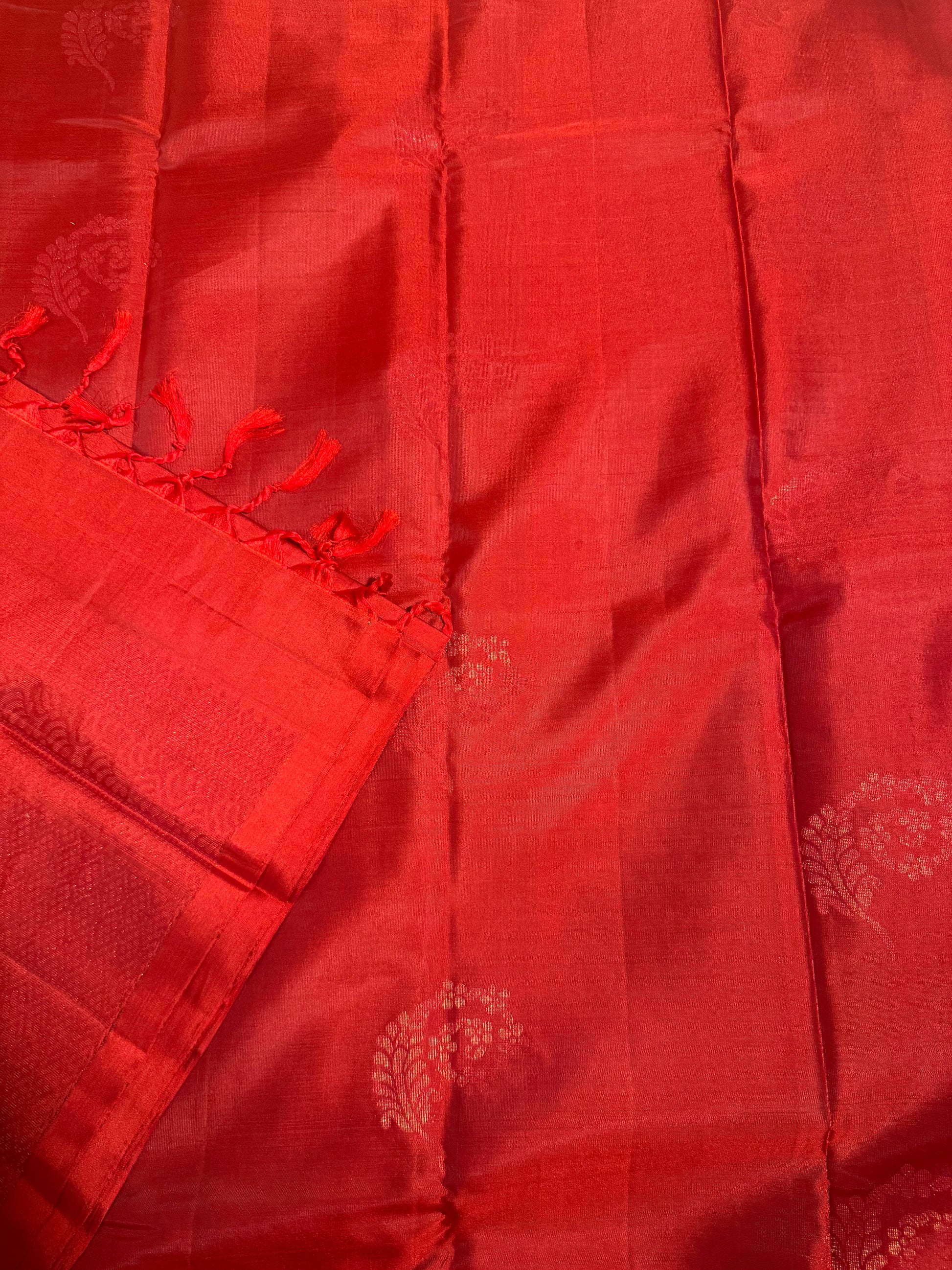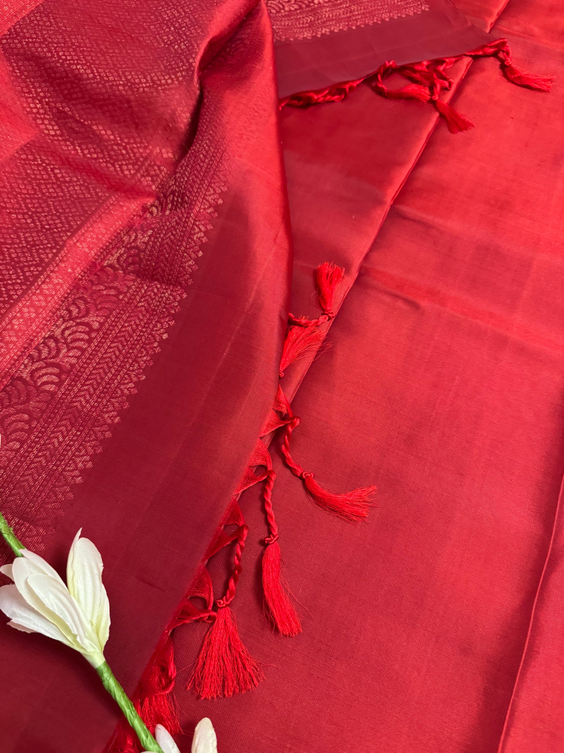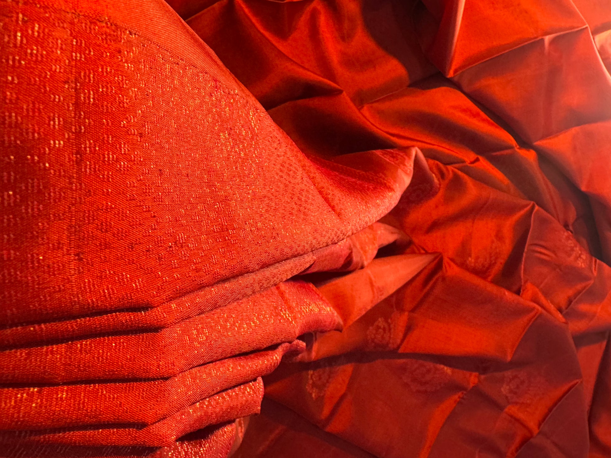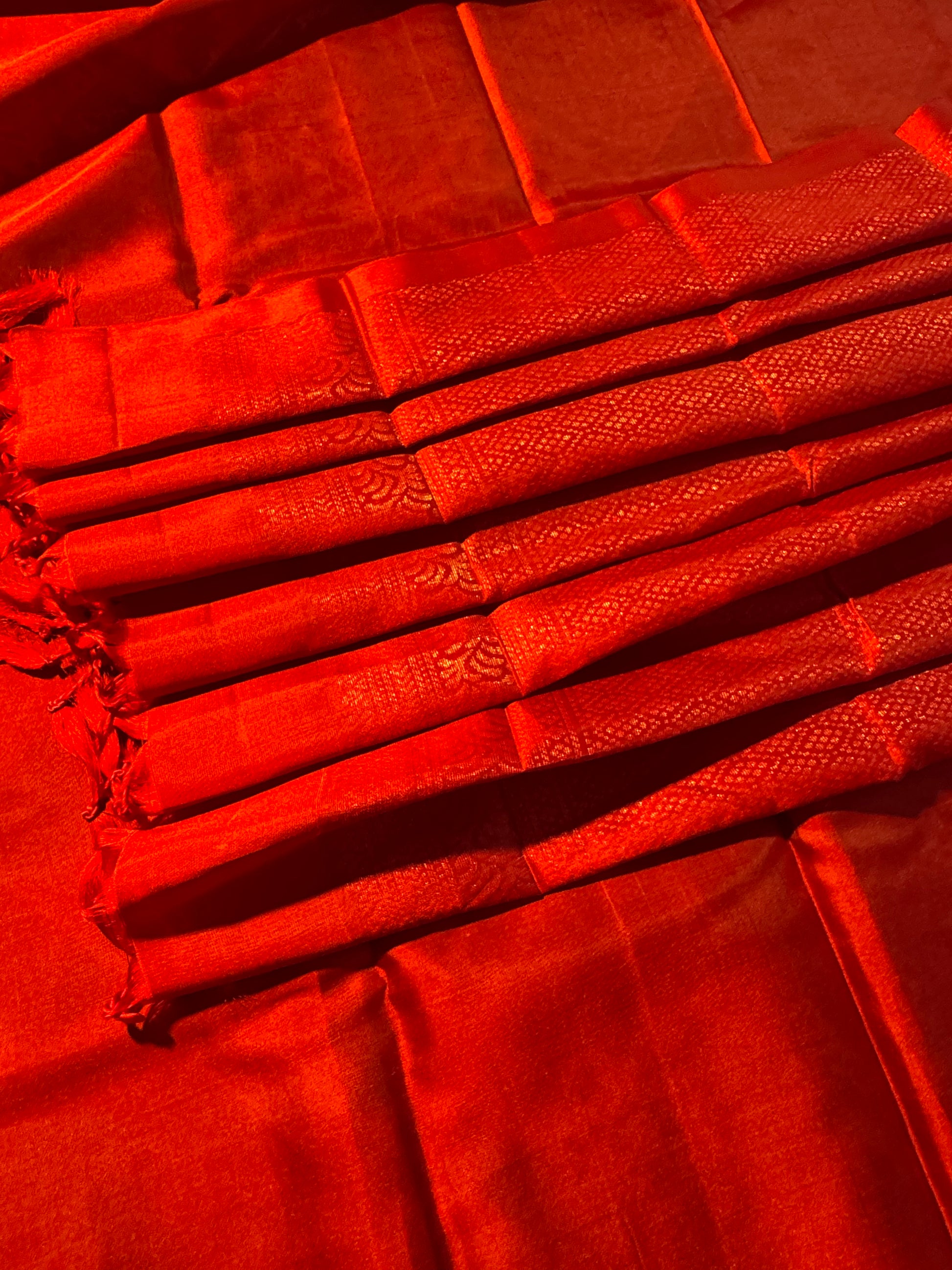 Ruhlaal — where red becomes a feeling. Woven in premium soft silk and touched with a subtle golden sheen, this saree captures the essence of heritage with the fluid grace of modern elegance. The hue is bold, sacred, and timeless — a color that tells stories without a single word.