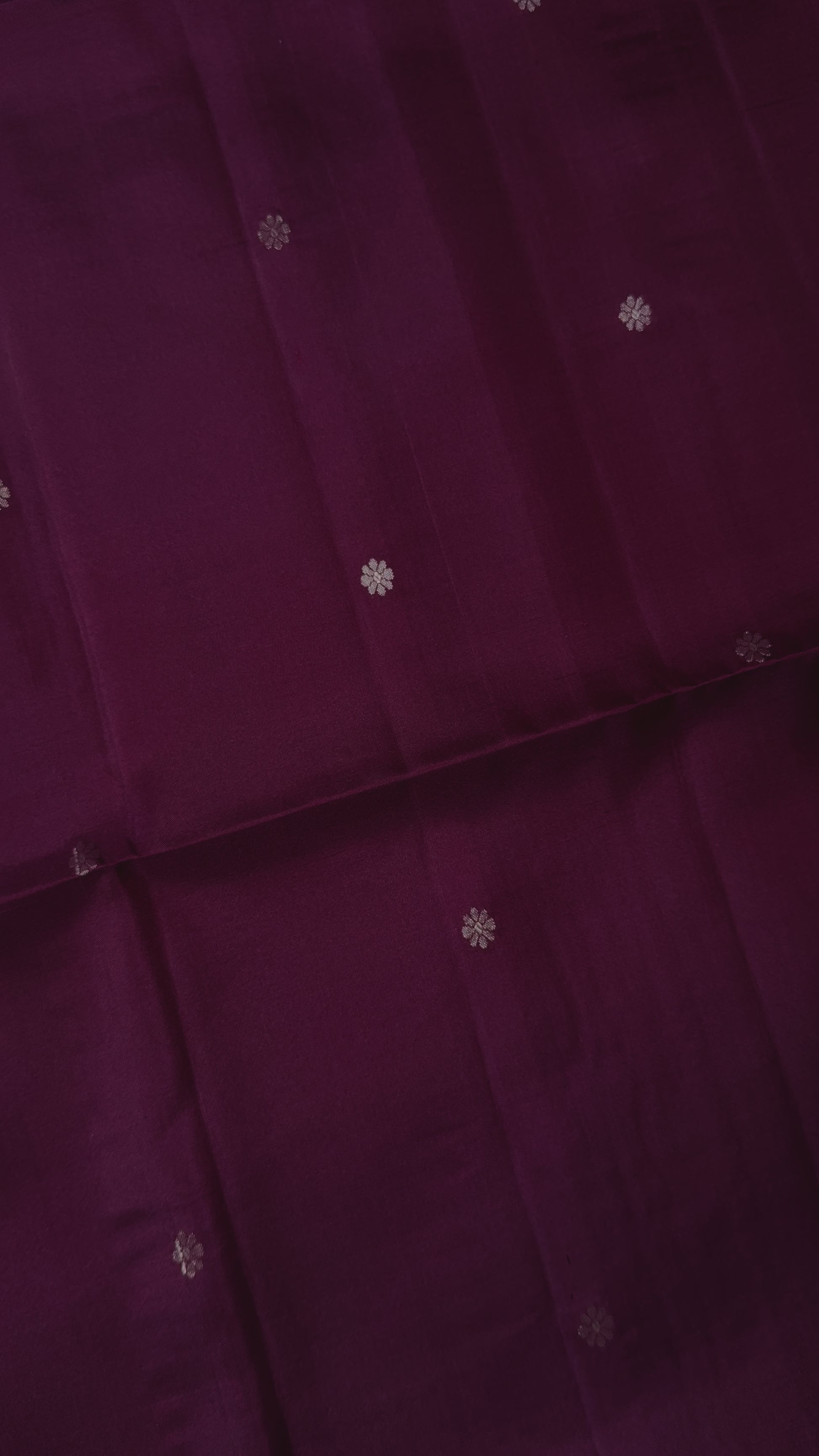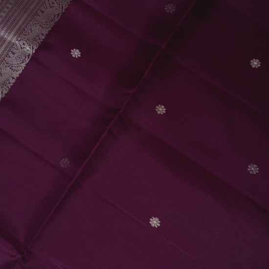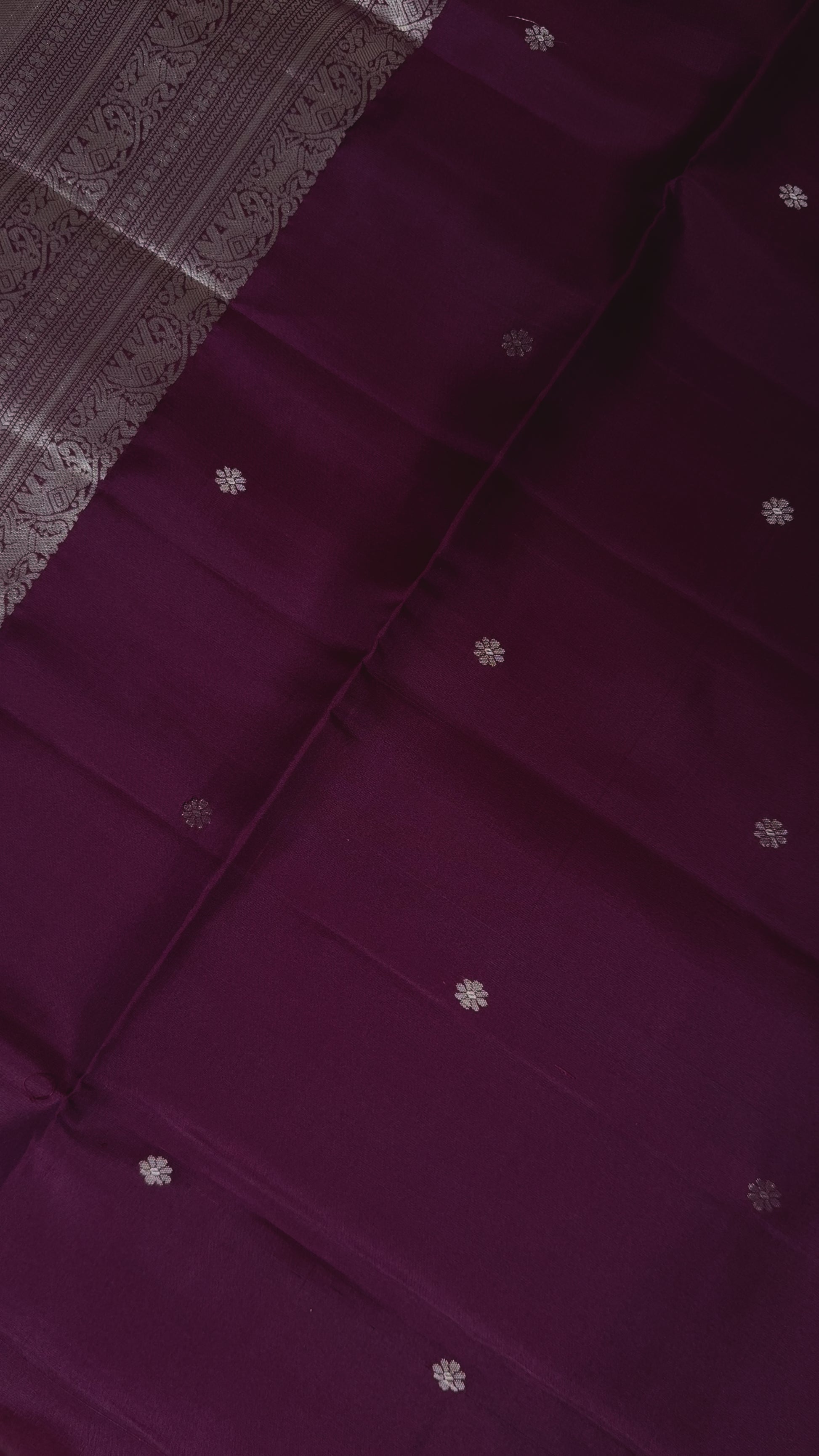 Color: Rich, dark purple with a beige and metallic silver pallu