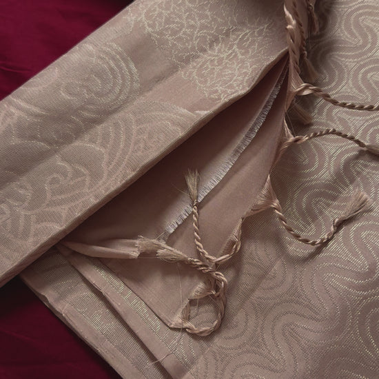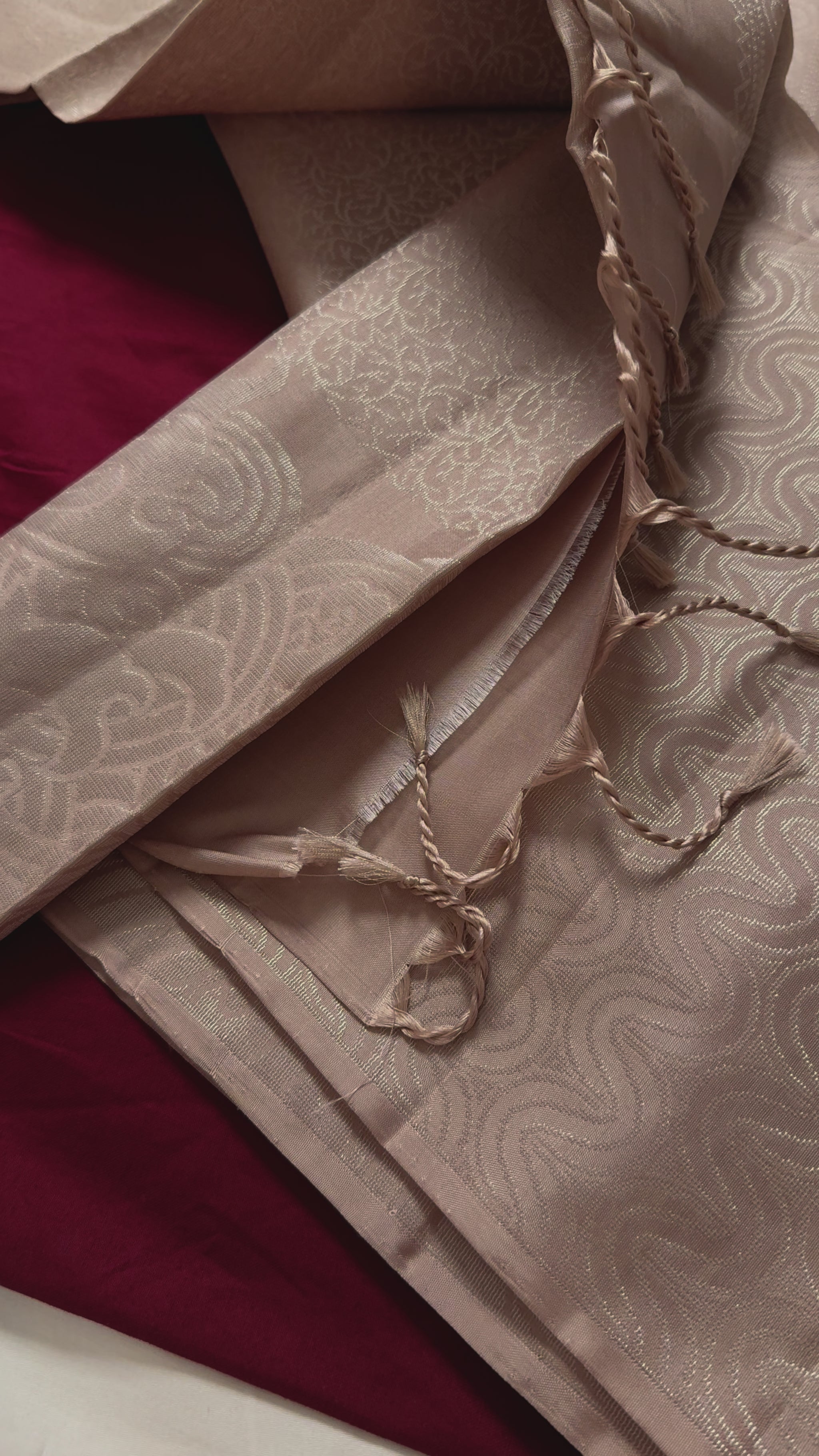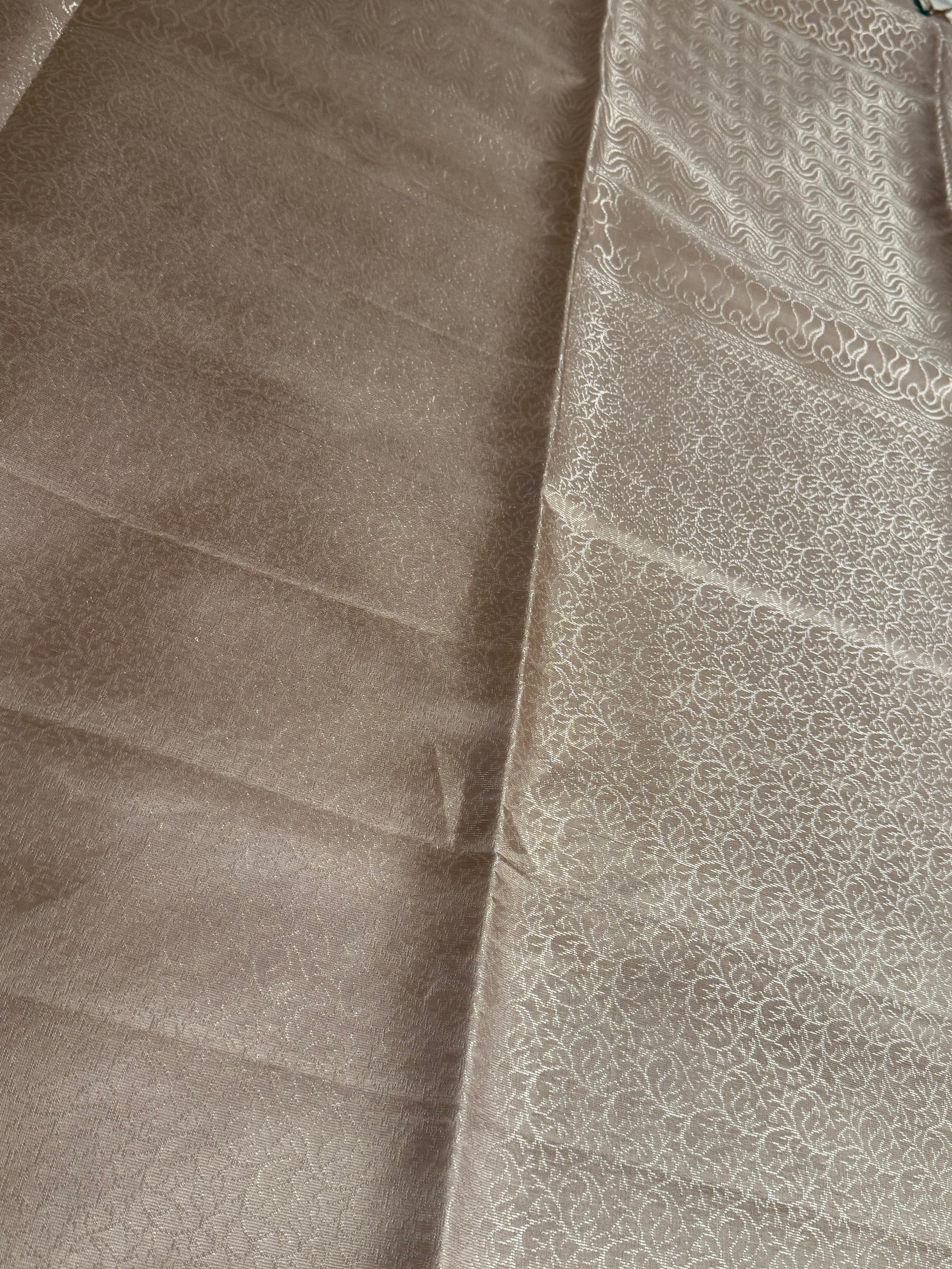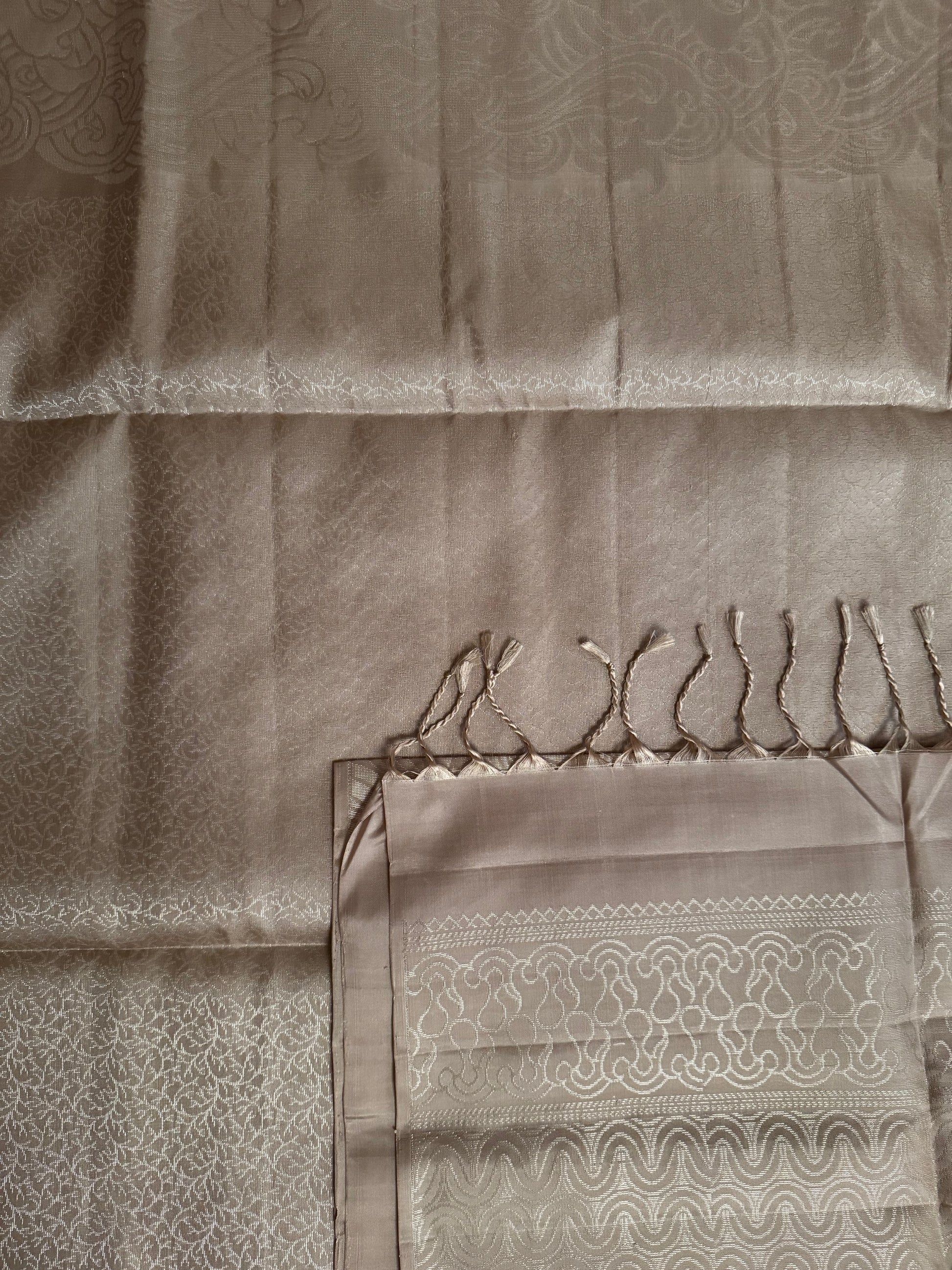 Woven in a luxe champagne-cream hue, this soft silk saree is adorned with delicate metallic zari motifs throughout, casting a gentle shimmer with every step. Its regal drape and timeless sheen make it perfect for the you who doesn’t just attend an event but illuminates it.